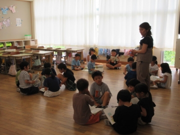 ぐるぅぷに わかれて、「ねずみさん」のせりふを くふうして れんしゅう しています。「おむすび ころりん すっとんとん。」