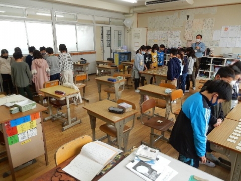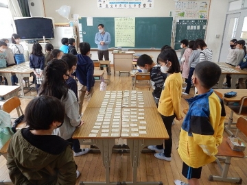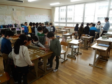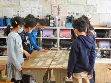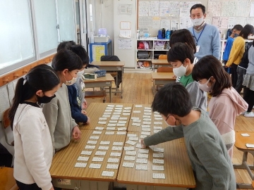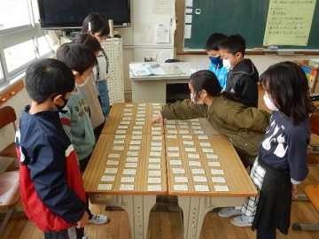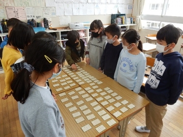 3年の子どもたちが、百人一首の源平合戦を行っていました。子どもたちは、上の句も下の句もきちんと覚えたそうです。「来てくれた!」などと言って教室に入ってきた私を歓迎してくれた子どもたちが、読み上げが始まったら真剣な表情に変わるのを観て、嬉しく思いながら写真を撮りました。