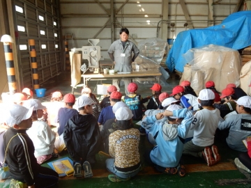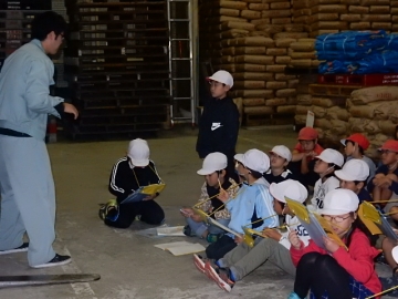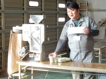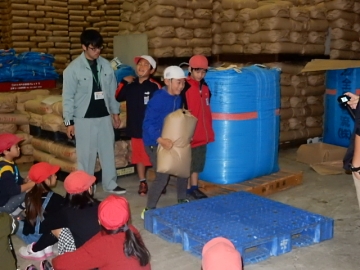 倉庫でお米の仕分けや保存についてお話を聞きました。