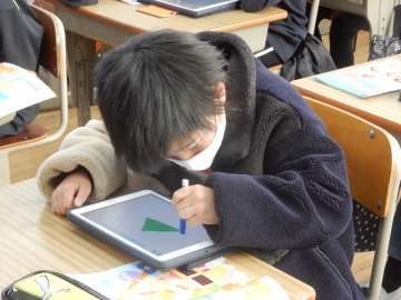 3年の子どもたちが、形を表す英単語についてのアクティビティを行っていました。子どもたちが、