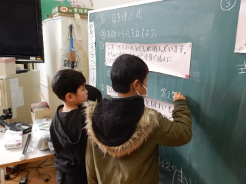 3.4年で、「▢を使った式」の授業研究会を行っていました。どんな授業をすると学び合いが深まり、わかる喜びを感じられるか研究しています。