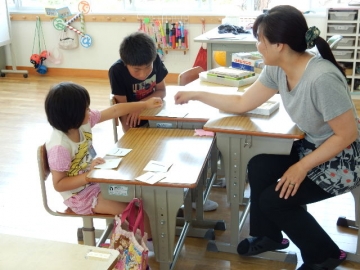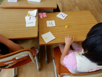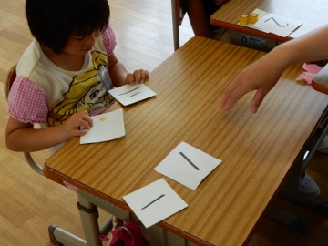 数字の概念を繰り返し繰り返し学んでいます。具体物と「いち・に」という言葉の音と「1・2・一・二」という表記を一致させます。5までの数字までが勝負。じっくしあせらず取り組んでいます。
