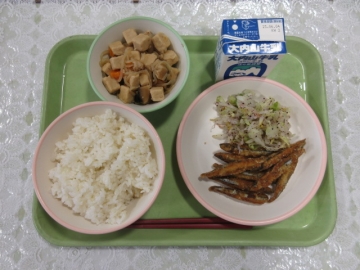 ・むぎめし ・きびなごのからあげ ・しそあえ ・こうやどうふのにもの