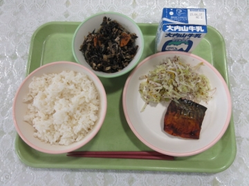・むぎめし ・さばのみそやき ・しそあえ ・ひじきのいりに ・牛乳