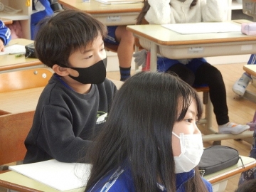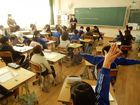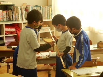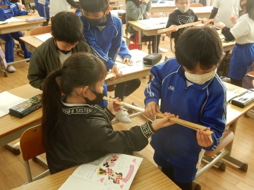 2年の子どもたちが、物の長さを測って、その表し方を調べていました。単元「長いものの長さのたんい」の学習です。授業の中盤に授業者が隠しもっていた長い(1m)物差しを取り出すと、子どもたちは「すごぉい!」と言いながらボルテージを一気に上げていました。