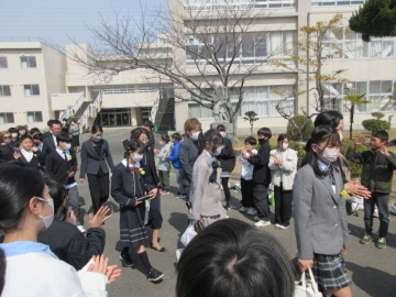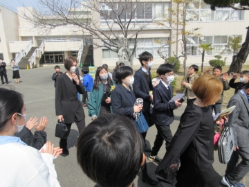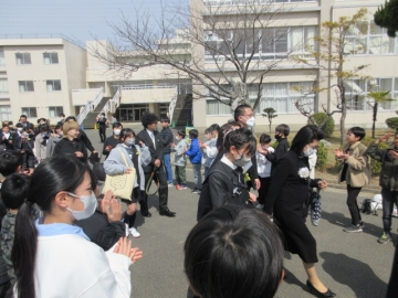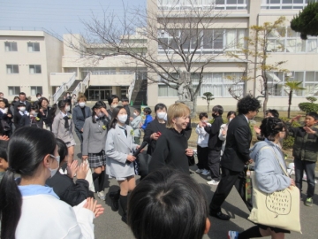卒業生とお家の方に並んで花道を通っていただき、みんなでお見送りします。