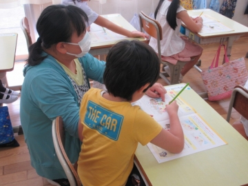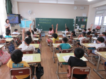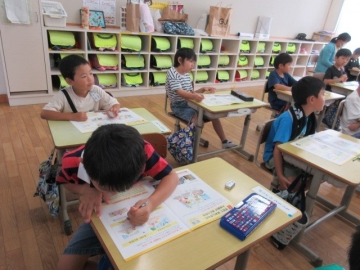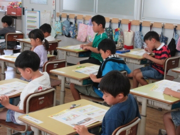 きょうは、「ぼうさいのぉと」を つかって、「げたばこの そば」「かいだん」「かえりみち」など、いろいろな ばしょに いるばあいに どうすればよいか まなびます。