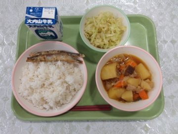 ・むぎめし ・ししゃものいそかあげ ・にくじゃがのカレーに ・こうみづけ ・牛乳