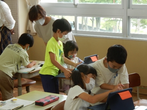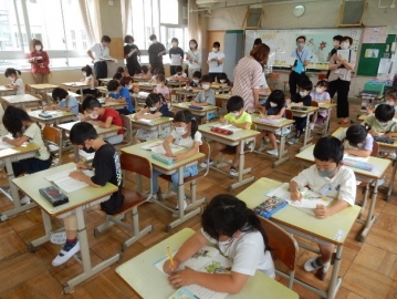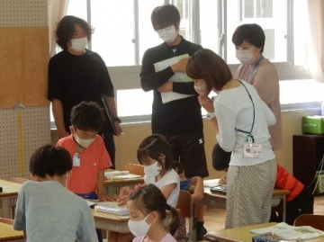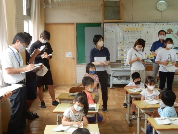 本校は、教員の授業力がさらに向上するよう、全員が一つの授業を参観し、それを基にして授業の在り方や展開策などについて協議する校内研修に取り組んでいます。今日は、市教育委員会指導主事の方と学びの共同体研究会スーパーバイザーの方を招いて、2限目に1年1組を担任している佐藤先生の授業を参観し、放課後にそれについての協議を行いました。授業は、子どもたちの学び合いによって場面の情景や登場人物の心情をイメージさせ、それをペア活動などの音読によって表現させる内容でした。