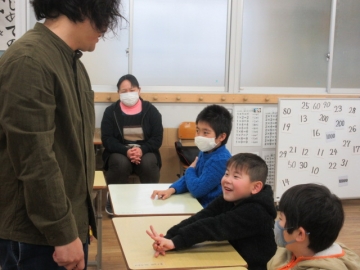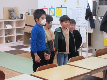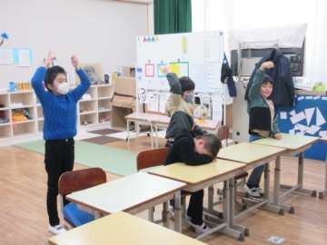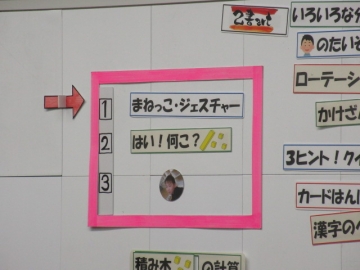 この時間は、まず「まねっこ・ジェスチャー」、次に「はい!何こ?」の学習に取り組みます。