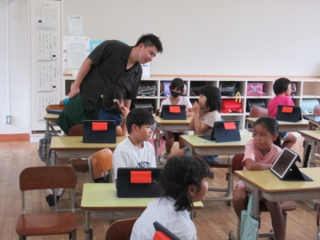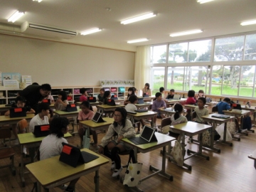 タブレットを使って自分の文を交流してから、「ペア」で5分間話します。この後、「ペア」はどんどん入れ替わります。