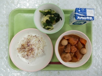 今日の給食は、おはなし給食の内容にちなんで、おでんが提供されました。献立は「味噌おでんとほうれん草のおひたし、しそと胡麻のふりかけ、麦飯、牛乳」でした。味噌おでんは、今日のような寒い日に合う一品です。絵本に出てきた具も入っていて、美味しくいただきました。