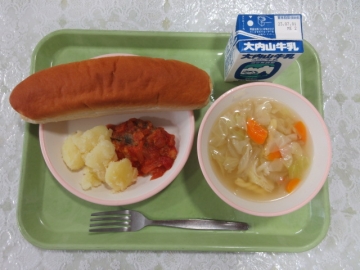 ・こめこいりパン ・アジのトマトソースかけ ・こふきいも ・マカロニスープ ・牛乳