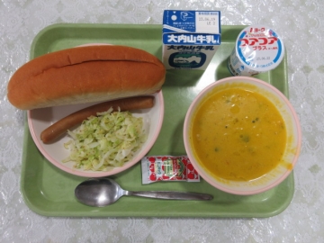 ・パン ・ソーセージ ・ケチャップ ・かぼちゃのとうにゅうポタージュ
