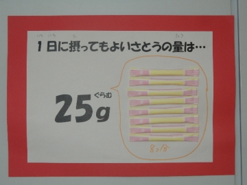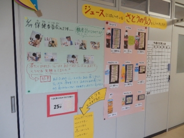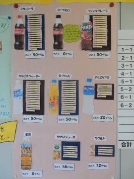 保健委員会が行った実験の結果が、保健室前の廊下に掲示してありました。糖度計を使って身近な飲み物に入っている糖分の量を調べたものです。暑い時季を迎えますが、清涼飲料水などの飲み過ぎに気を付けましょう。