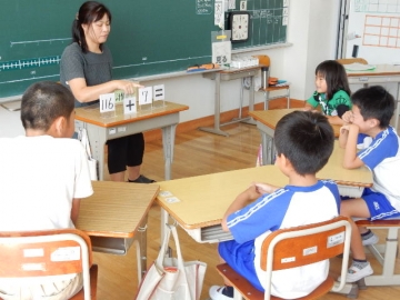 【ローテーションカード】次々に、子どもたちにあった計算式をフラッシュカードのように出していきます。何秒でできたか記録に挑戦しています。