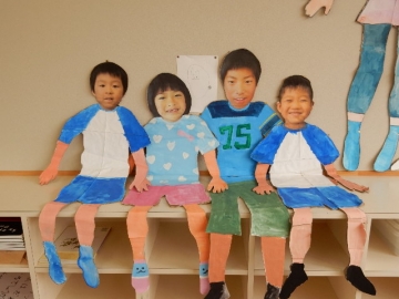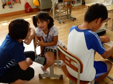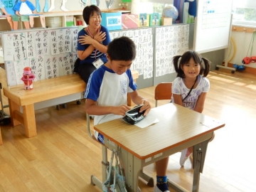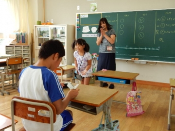 6年生と1年生がいっしょに勉強をしていました。国語の勉強です。夏休みの思い出を簡単な文章で表します。最初の文字をひらがなで3つ書き、どんな内容かあてっこをしながら、作文の力をつけていきます。最後に、どんな気持ちだったかを漢字一文字で表して、4字熟語として完成します。1年生には難しいので、6年生のお兄さんが書いてあげたり、教えてあげたりして進めていました。