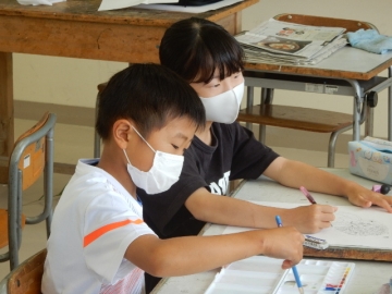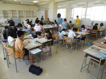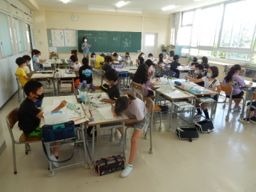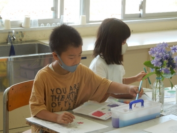 3年の子どもたちが、紫陽花の水彩画を描いていました。少しずつ違う花毎の形や色の写実に苦労している子もいるようです。焦ったり決め込んだりしないで、しっかりと見て描きましょう。