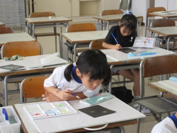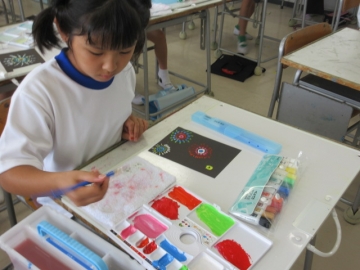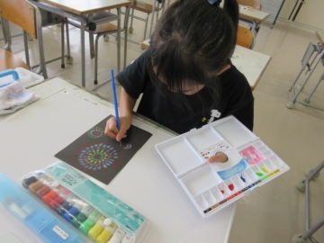 黒い画用紙に、明るい色の絵の具を使って「花火」をかきます。