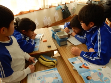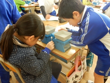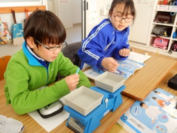 上皿てんびんで重さを比較します。つりあわせるだけでも大変です。