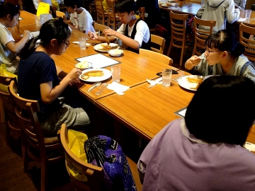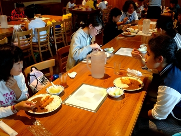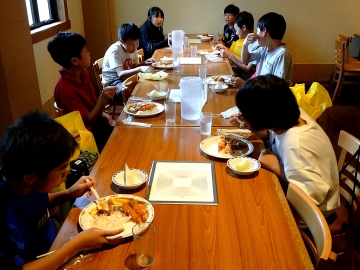 子どもたちが使う自由な時間を少しでも長く確保するため、遅めの昼食を取りました。メニューも、ほとんどの子どもたちが好きなカレーライスとデザートがセットされたものです。