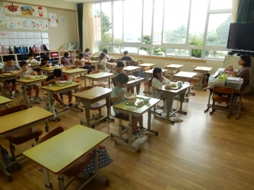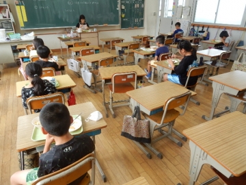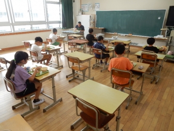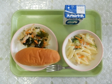 今日から給食が始まりました。献立は、クリームペンネとわかめサラダ、パン、牛乳です。私も検食後に全ての教室を見て回りましたが、子どもたちが「完全黙食」を守っているので、教室内は食器のカチャカチャ音しか聞こえません。なお、教室面積当たりの児童数が多い2年と3年については、職員室用務の教員や少人数教室などを使って、可能な限りの分散給食を行っています。