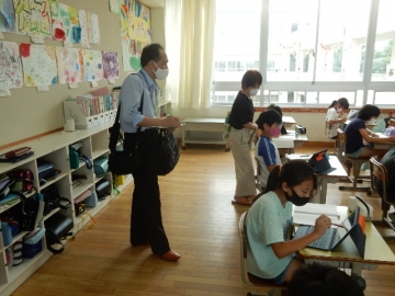 県教育委員会事務局と市教育委員会事務局の視察がありました。各学級の授業を参観していただいたり、本校の現況などについて説明したりしました。職員の研修やタブレット型パソコンの活用、感染症対策などについても話題に上がりました。