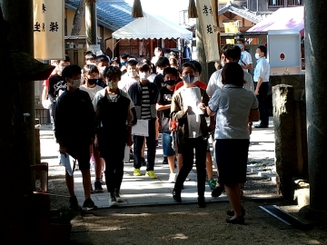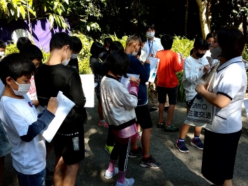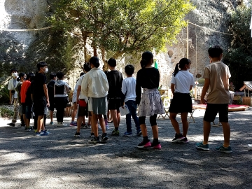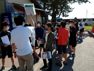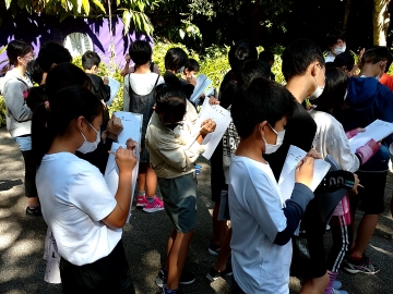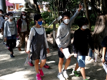 最初の訪問先である「花の窟」に到着しました。今日は、秋の大祭が行われる日だそうで、たくさんの氏子の方々もみえていました。子どもたちは、社殿がなく、巨岩を信奉する内容の説明を珍しそうにメモっていました。