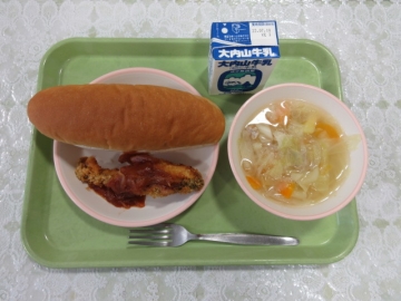 ・パン ・ほきフライ(ソースをかける) ・やさいスープ ・牛乳