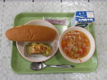 ・パン ・ツナとポテトのグラタン ・ABCスープ ・いちごジャム ・牛乳