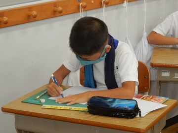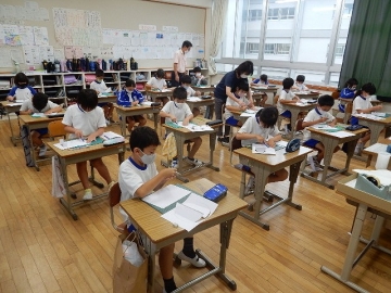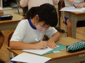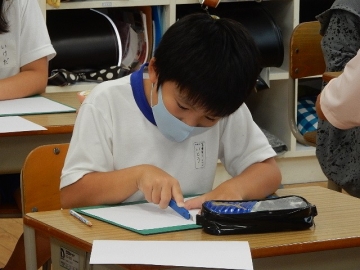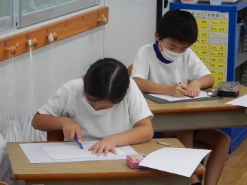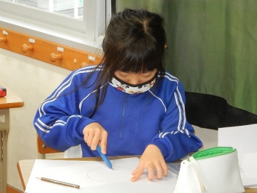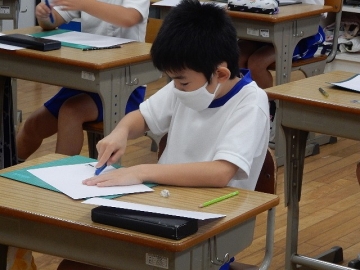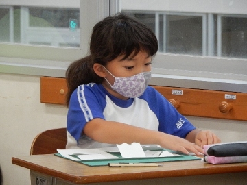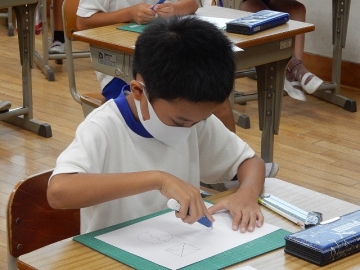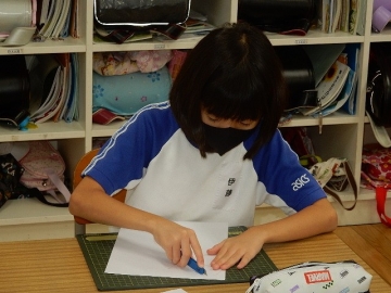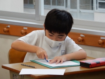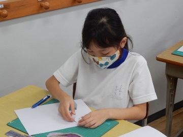 単元「ひらいて 広がる ふしぎな せかい」に入りました。初めてカッターナイフを使う子も多く、今日のめあては使い方の基本を習得することです。「早く使ってみたい。」や「ドキドキする!」などと嬉しそうに言う子もいれば、怖がって力が指先に入らない子もいました。