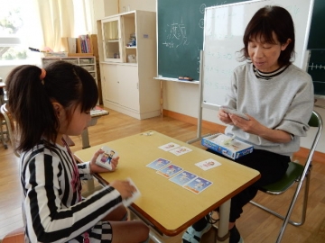ちょうど、カードをかるたのようにおいて、3つのヒントを与えて、どのカードかを見つけて取るゲームをしていました。最後までちゃんと聞いてないと取れません。