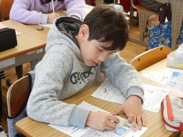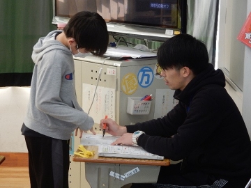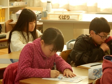 ミニテストを行っていました。解答し終わった子から順に採点してもらって、次につながるコメントや解くためのヒントなどをもらっていました。