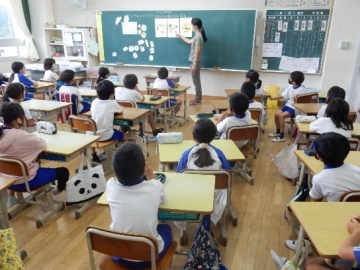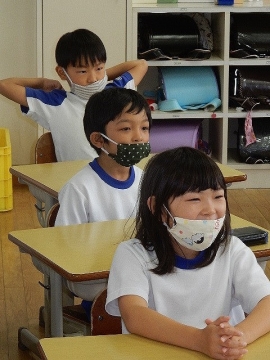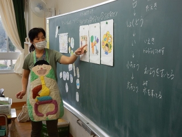食べ物の消化と吸収についての学習です。授業者の栄養教諭がキルトの人体模型(?)などを使って楽しく授業を進めていました。子どもたちの反応も良く、身を乗り出して授業者の問いに答えている子もいました。
