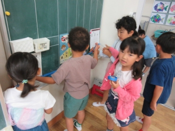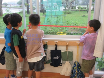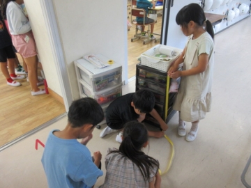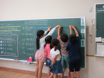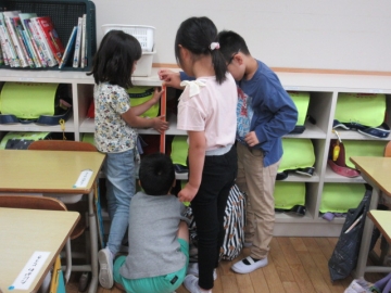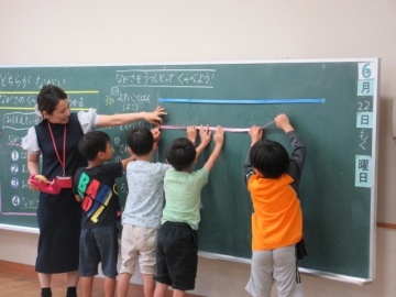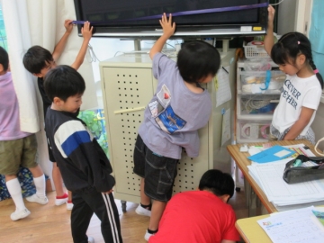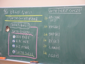 ながさの くらべかたを かくにんしました。いまから ぐるぅぷに わかれて、 いろいろなばしょの ながさを はかります。