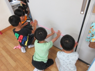 それぞれの ぐるぅぷが かみてぇぷを はりおわりました。ながさを くらべています。