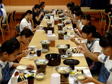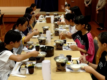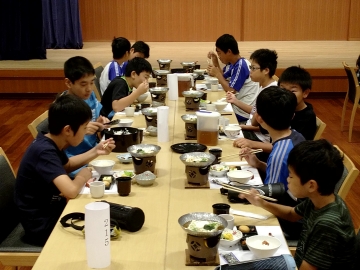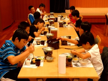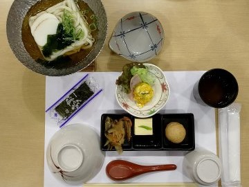 朝食の時間です。メニューは、温かいうどんが付いた和食でした。