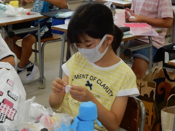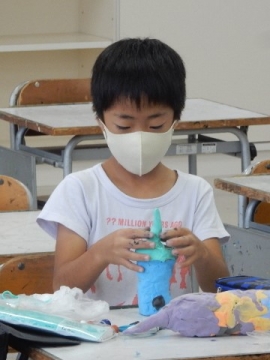 単元「空ようきのへんしん」に取り組んでいました。空き缶や空パックなどを使って大まかな形を作った上、紙粘土や絵の具などを使って装飾していく工作です。写真を撮りながら回っていると、たくさんの子が自らの作品構想を楽しそうに説明してくれました。