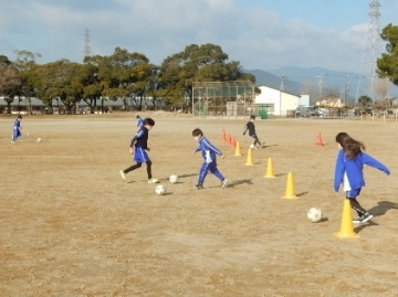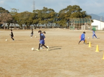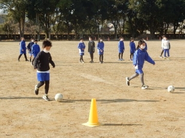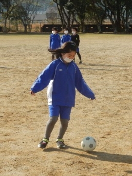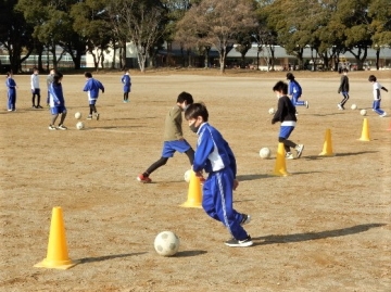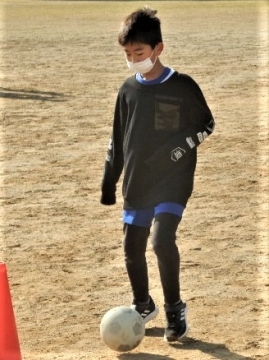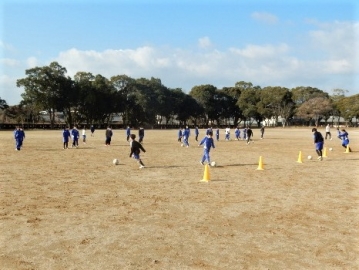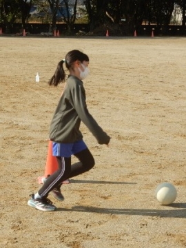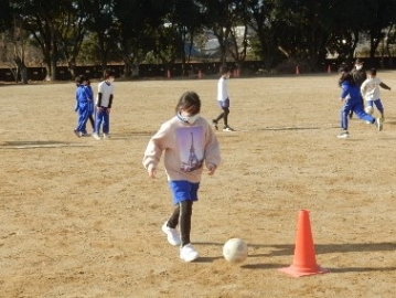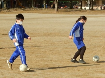 3年の子どもたちが、運動場に出て、サッカーを行っていました。新型コロナウイルス感染が流行しているので、運動中もマスクを着用したままですし、子どもたちが密集しやすいゲーム形式の活動なども止めています。様々な制約を受けた中、子どもたちは元気よくボールを蹴っていました。