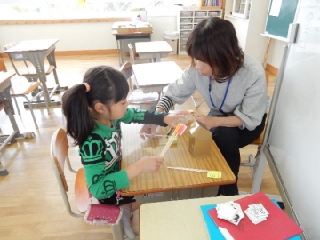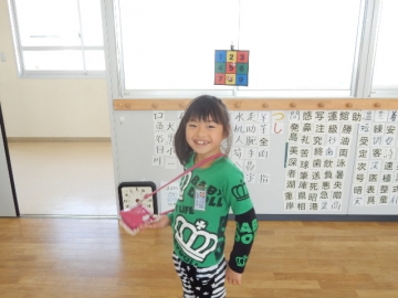今日は、2年生と先生が4までの数字の学習を、ゲームにして進めていました。わりばしを旗にして1~4までの数字を描いた割りばしの旗を順番に抜いて、どっちが大きいか、どっちが勝ったかをゲームで楽しんだり、数字絵カードを使ったりしていました。的当てをいっしょにやらせてもらいました。