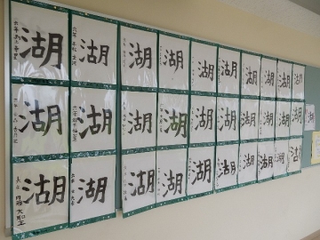 子どもたちが書写した毛筆の「湖」が3階の廊下に掲示されていました。今回のめあては、別の字が組み込まれている漢字の整え方を学ぶことです。小学校書写の学習をまとめる入口に当たります。