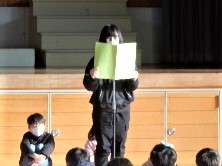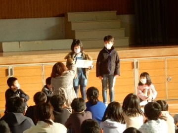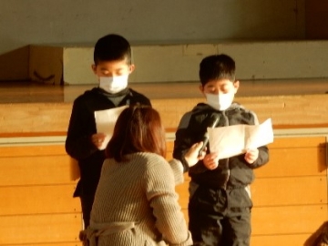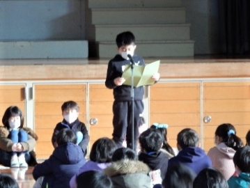 2学期の終業式を行いました。まず、校長が講話した後に、もうすぐ産前休暇を取る予定の教員が子どもたちに向けて挨拶しました。そして、今回は、1年と3年、5年の代表者が2学期の学校生活を振り返った作文を披露しました。毎日の授業やかんべっ子広場などについてしっかりと考えていて、いずれも聴き応えがある内容でした。最後に、生徒指導を担当する教員が冬休み中の生活について話しました。