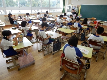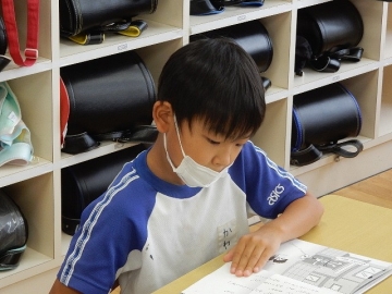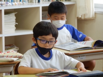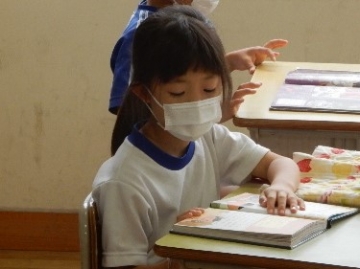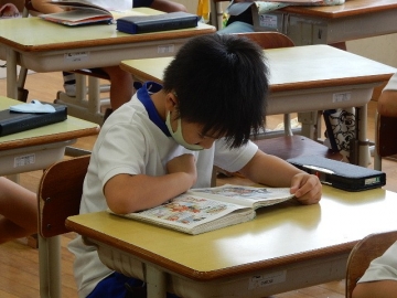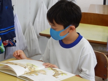 2年の教室に入ると、子どもたちが静かに本を読んでいました。それぞれが、図書室に行って借り換えてきた本だそうです。じゃましないよう、早々に教室を出ました。