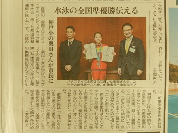 奥田真由(5年)さんの記事が中日新聞三重版に掲載されました。水泳の全国大会が開かれ、50mバタフライにおいて準優勝の記録を取ったことを市長に報告した内容です。結果とともに、4千mを毎日のように泳いでいることやオリンピックの出場を目指していることも紹介されています。