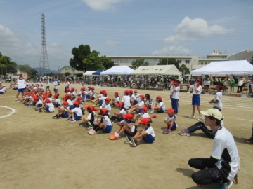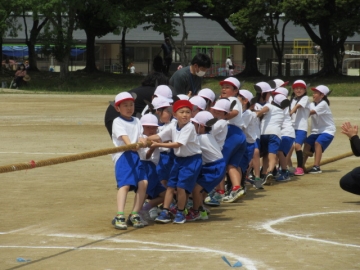 全校のみんなで、綱引きをします。ここ3年ほど、接触する活動を行えなかったため、初めてルールを知った子もいました。