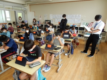 本校は、教員の授業力がさらに向上するよう、授業を互いに提案し合って協議する校内研修に取り組んでいます。今日は、6年1組を担任している竹内先生が算数の授業を高学年部に所属する教員などに提案しました。自作のミニオンも使って小気味良く展開する楽しい授業でした。