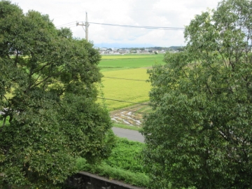 3階廊下からの風景。周囲の田んぼも、稲刈りが進んでいます。