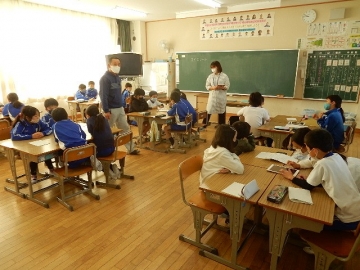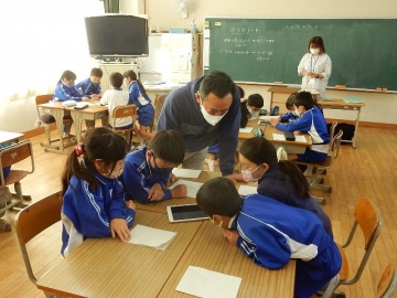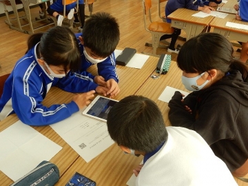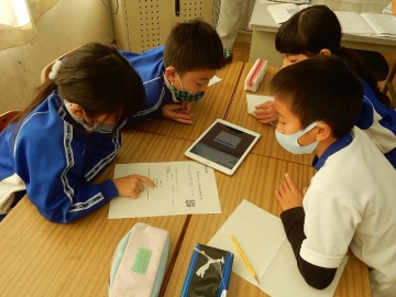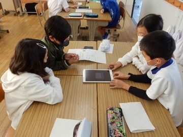 タブレット型コンピューターを使用し、授業支援クラウド「ロイロノート」の使い方を習っていました。市教育委員会からGIGAスクール支援員も来てもらっています。ほとんどの子どもたちは、コンピューターなどの扱いに慣れているらしく、サクサクと操作していました。