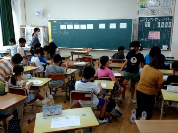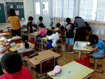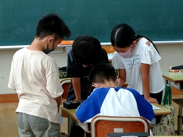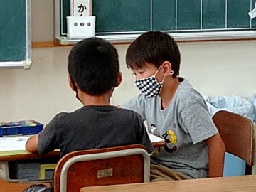 教室に入ると、様々な図形から三角形と四角形を探しているところでした。三角形と四角形の特徴を理解することがめあてです。子どもたちは、各自が考えたり数人が集まったりしながら課題に取り組んでいました。