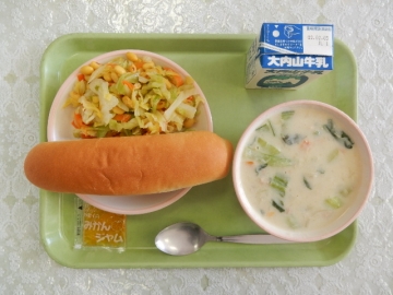 』にちなんで、サラダが提供されました。献立は「チンゲン菜のクリーム煮とカレー風味の大豆サラダ、ロールパン、みかんジャム、牛乳」で、
